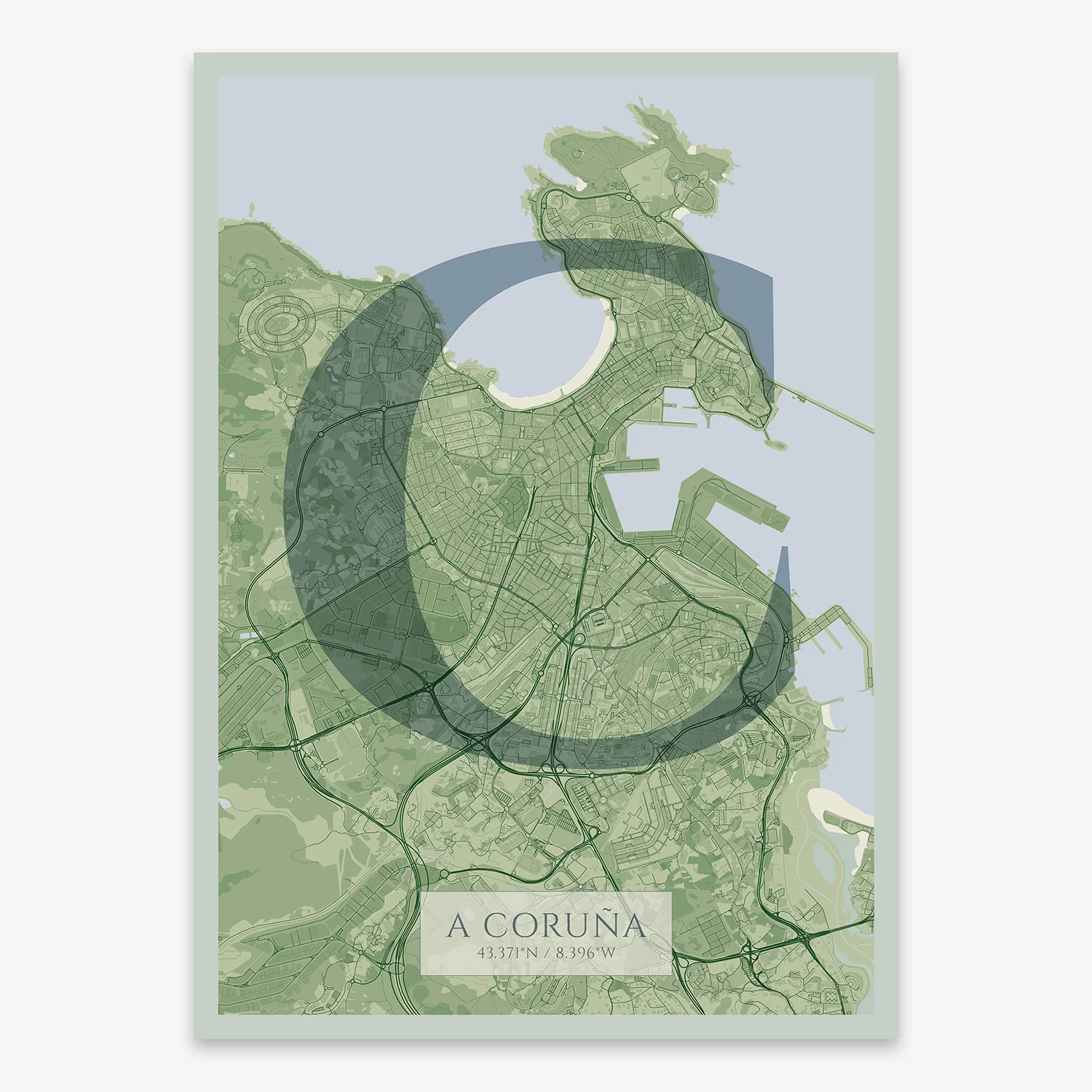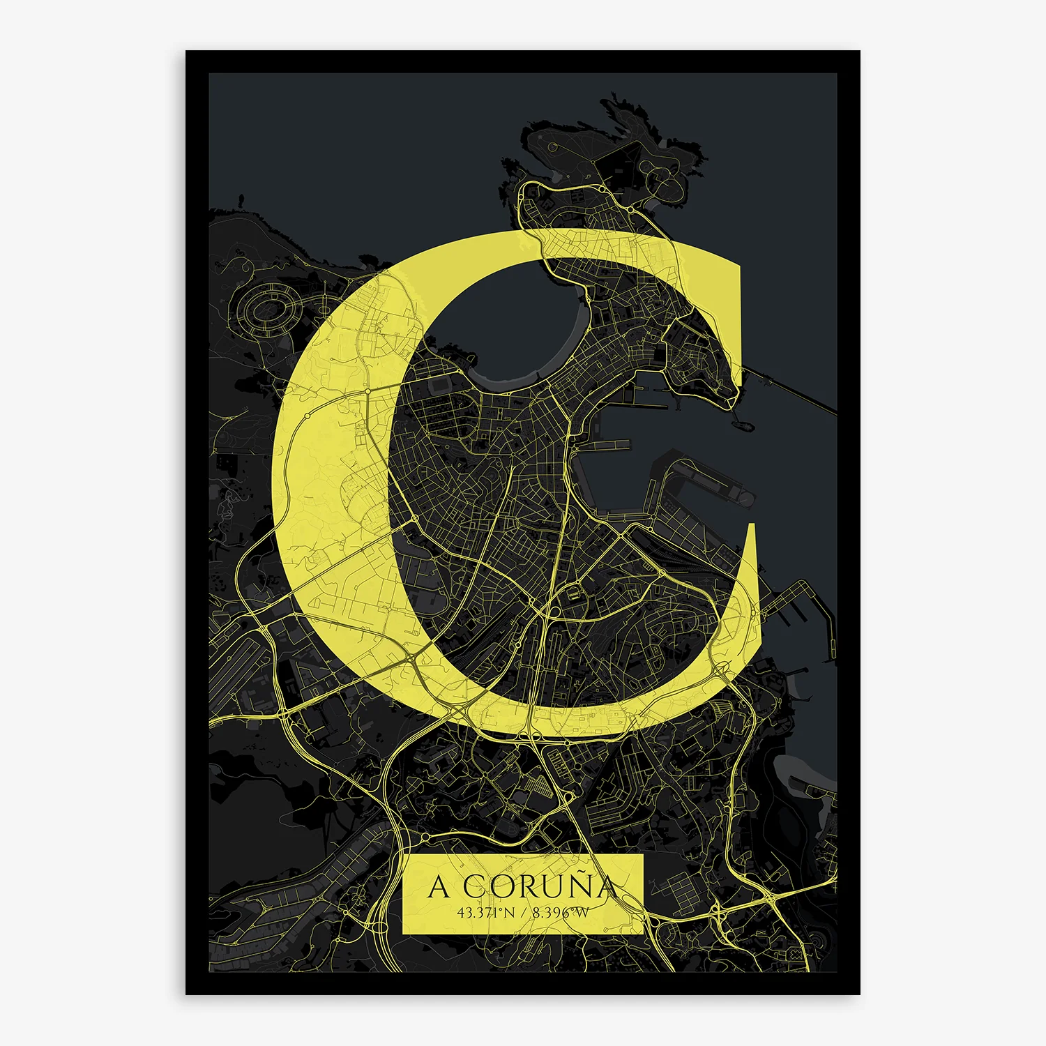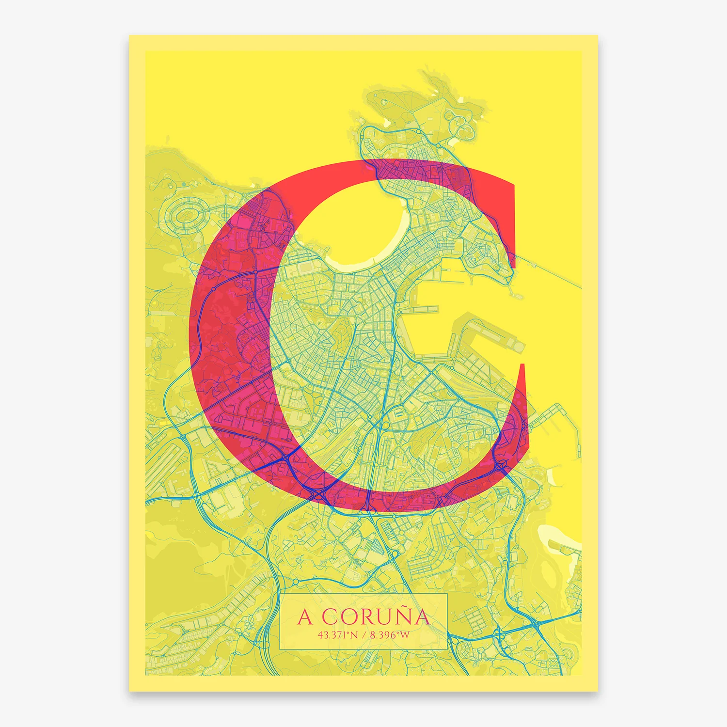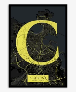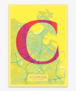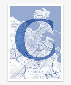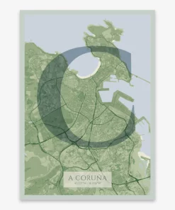 Personalize this A Coruña Poster V06, designed with a composition of the map of A Coruña and the letter C or purchase it with this graphic design ready to add to your cart. A special gift to decorate the walls of lovers of graphic design and typography.