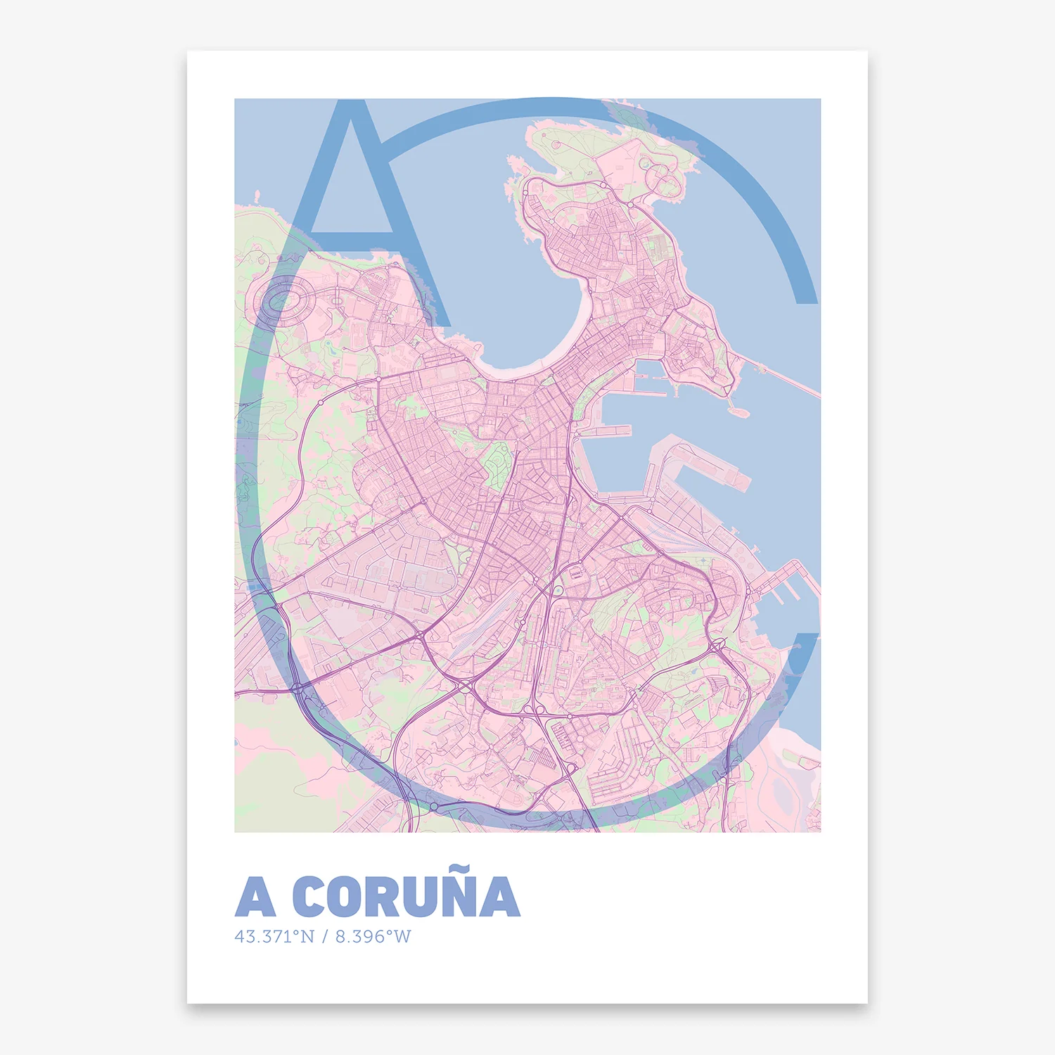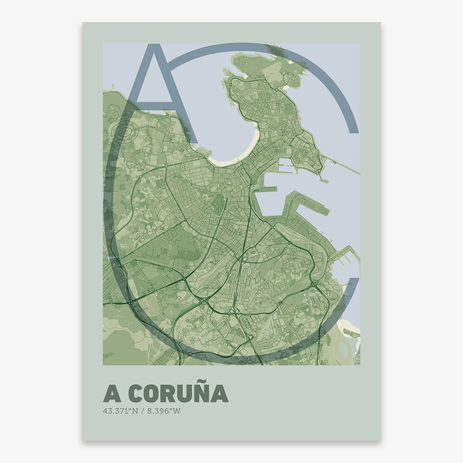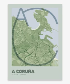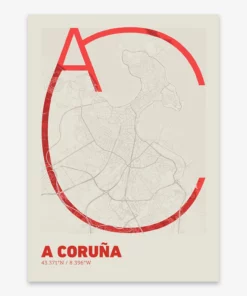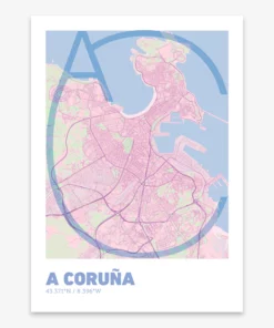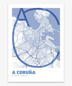 Personalize this A Coruña Poster V07, designed with a composition of the map of A Coruña and the letters AC or purchase it with this graphic design ready to add to your cart. A special gift to decorate the walls of lovers of graphic design and typography.