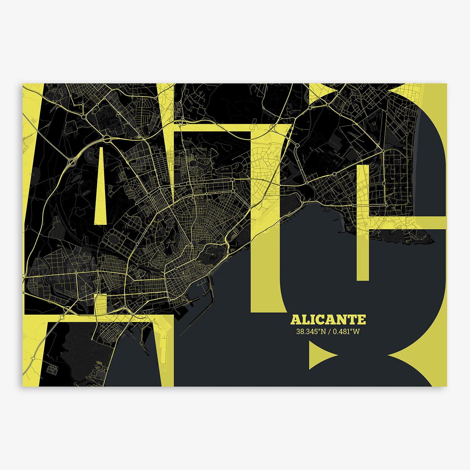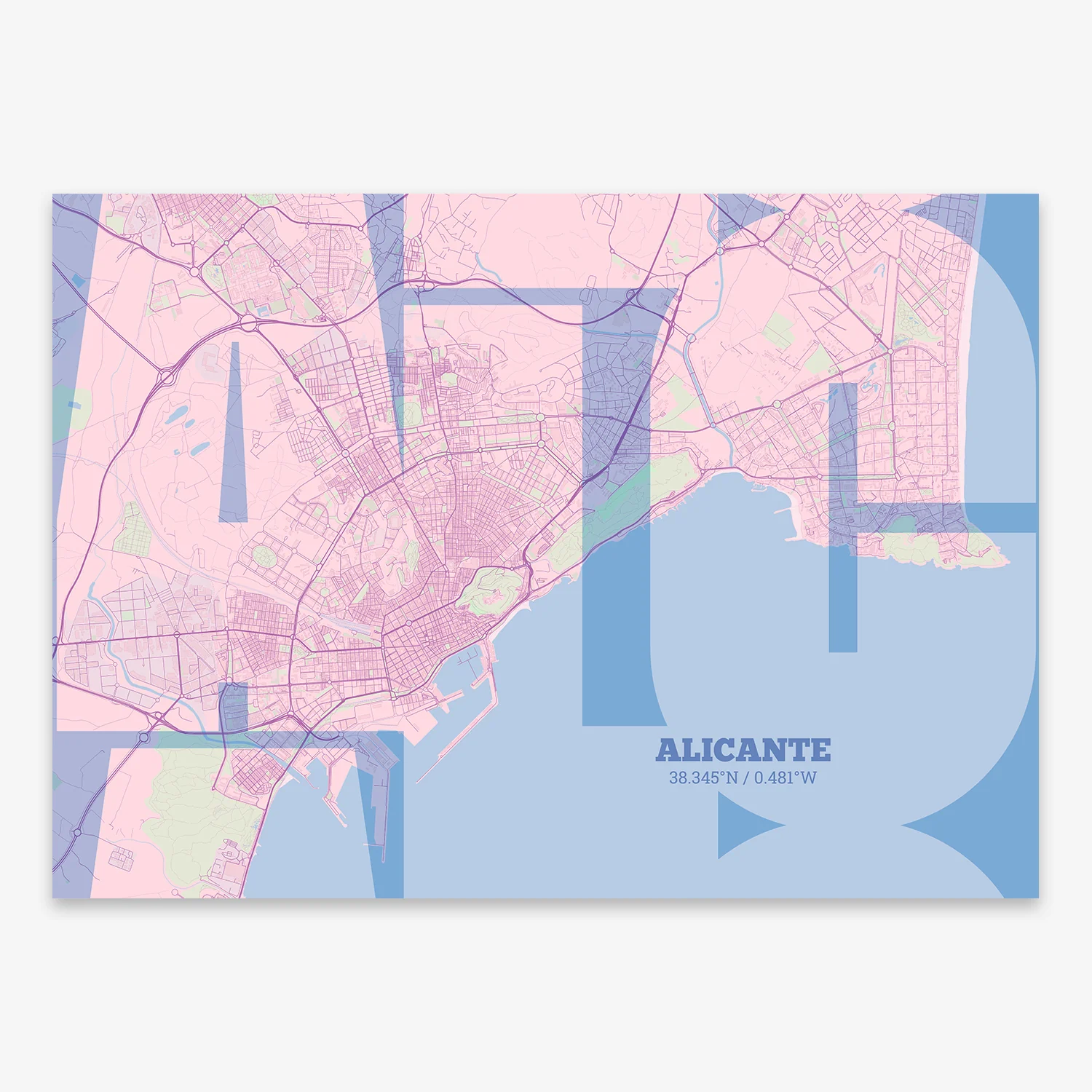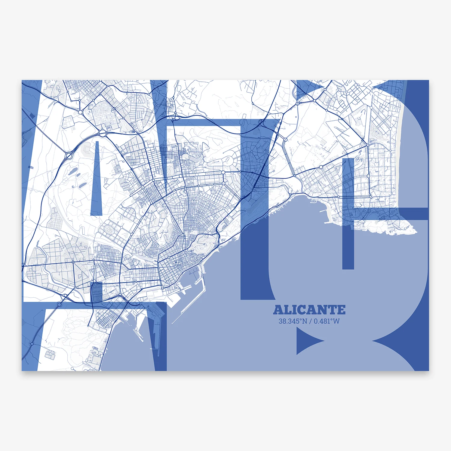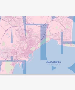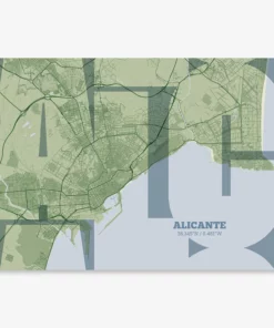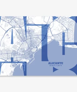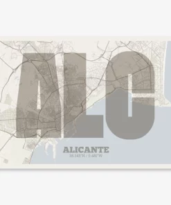 Personalize this Alicante Poster V03, designed with a composition of the map of Alicante and the letters ALC or purchase it with this graphic design ready to add to your cart. A special gift to decorate the walls of lovers of graphic design and typography.