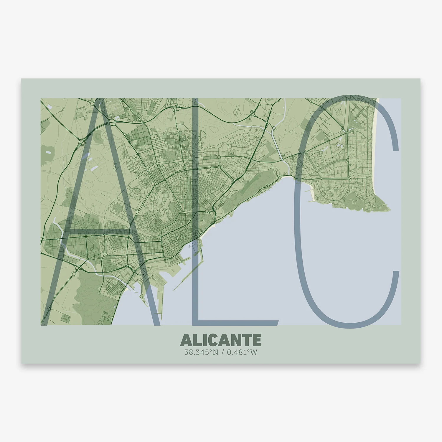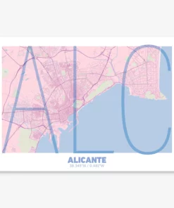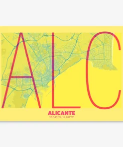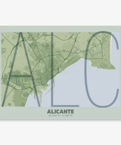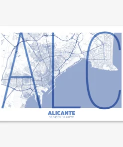 Personalize this Alicante Poster V07, designed with a composition of the map of Alicante and the letters ALC or purchase it with this graphic design ready to add to your cart. A special gift to decorate the walls of lovers of graphic design and typography.