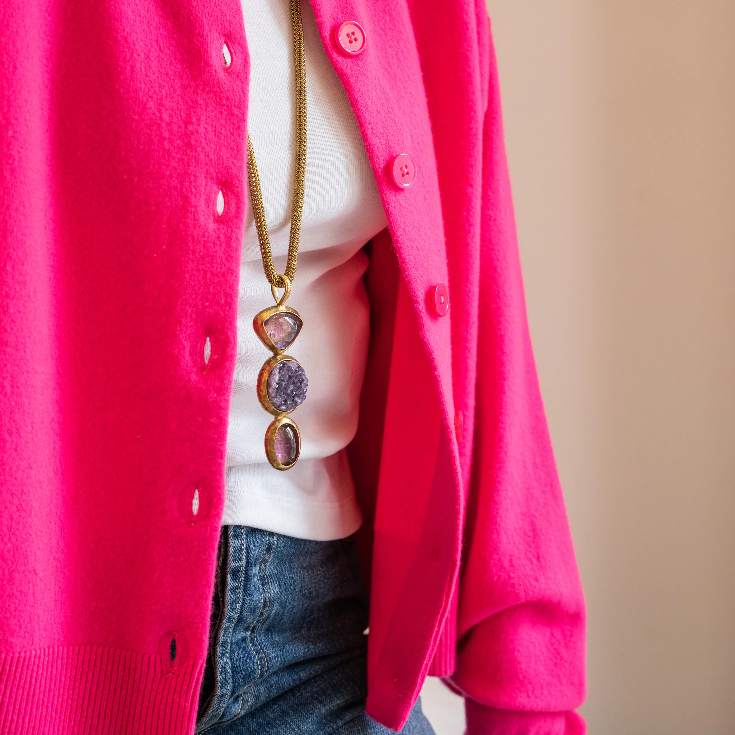 Collar con tres Amatistas grandes e irregulares en forma y tamaño biseladas en latón, se trata de una pieza única que incluye la cadena.