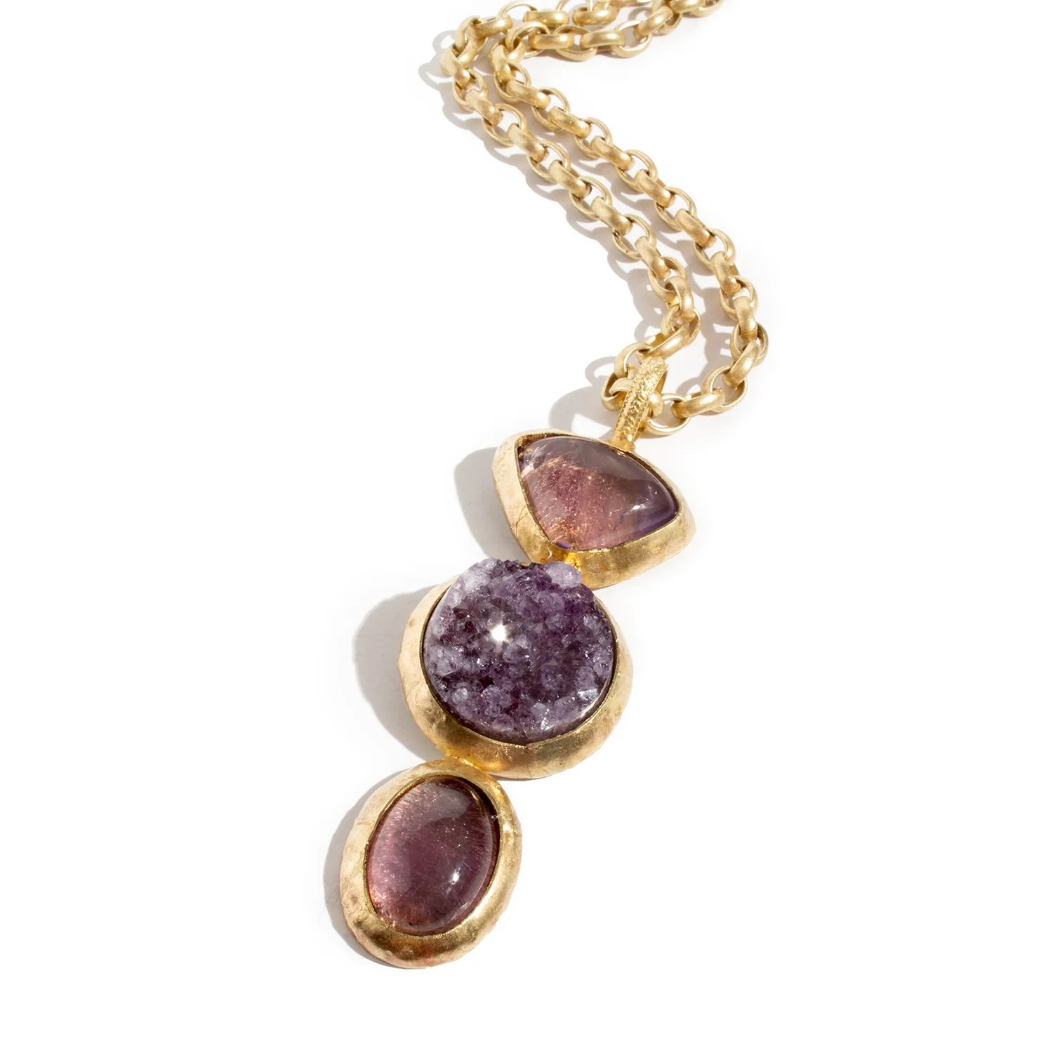 Medidas: Cadena 45cm / Amatistas 20×30mm y 18x25mm, Drusa 29mm / Largo total colgante 9cm