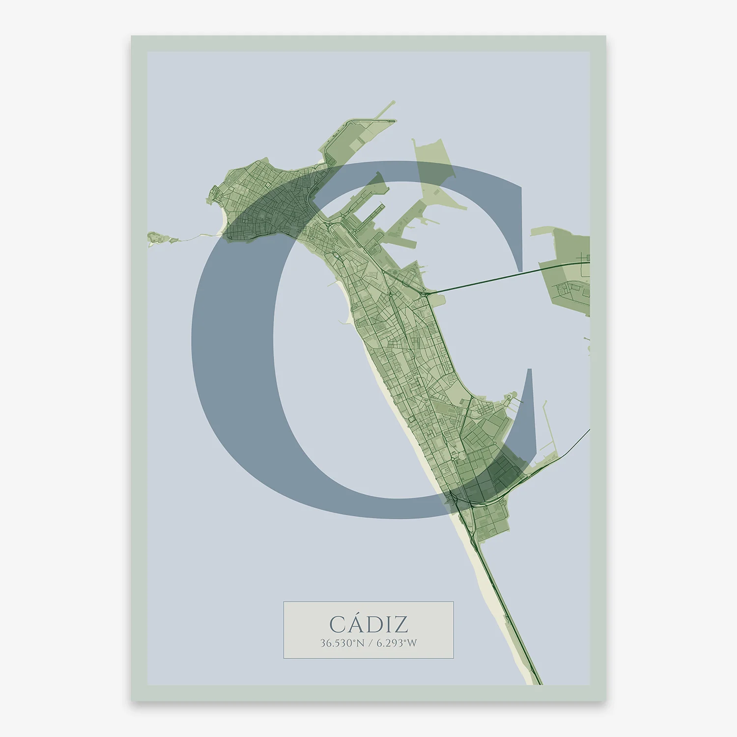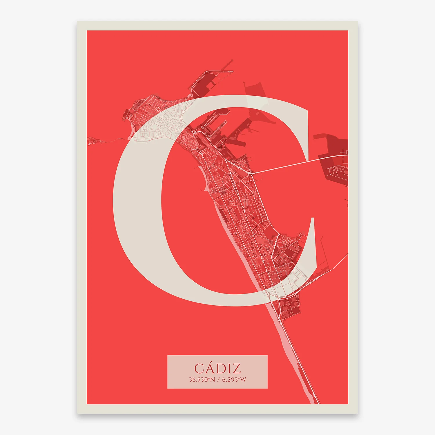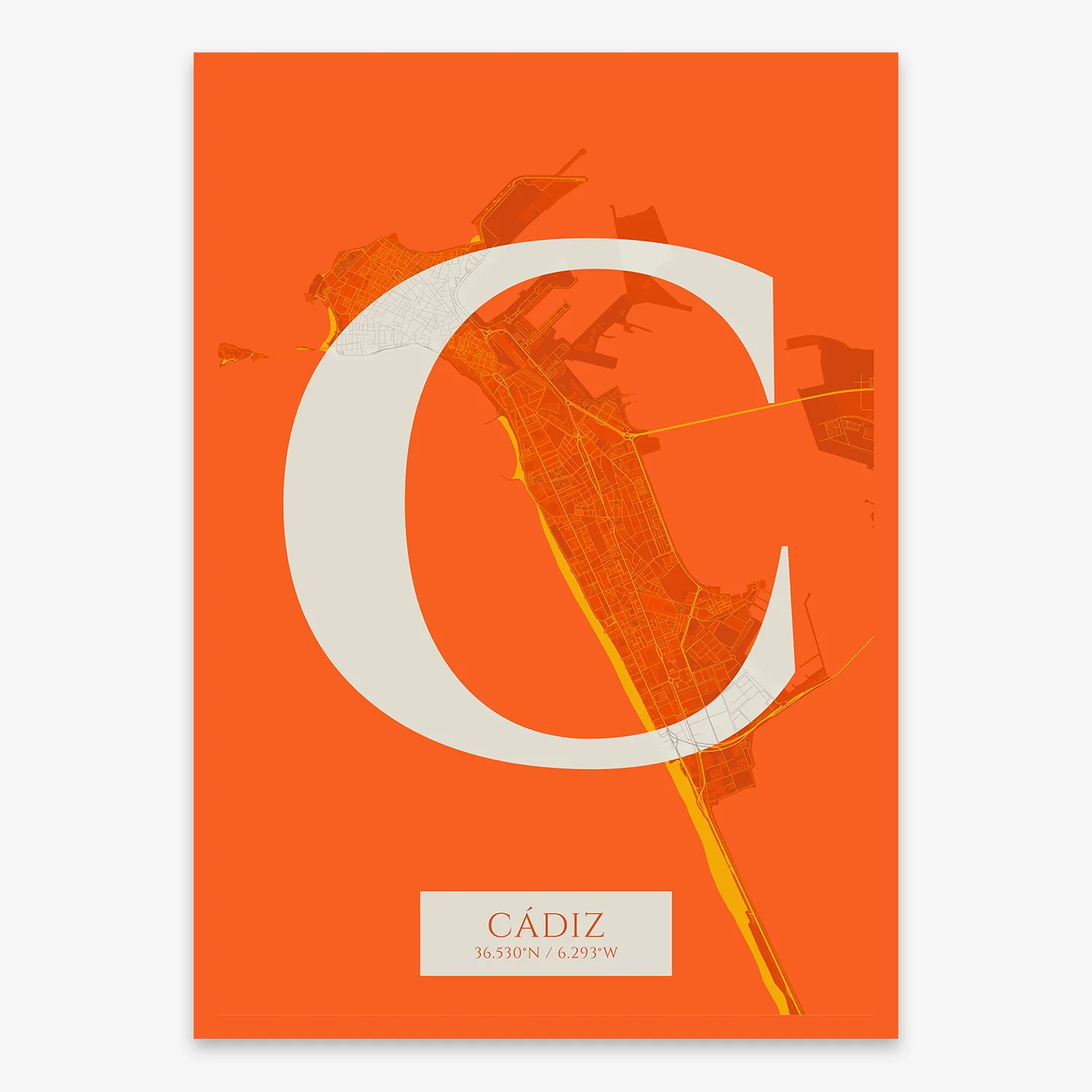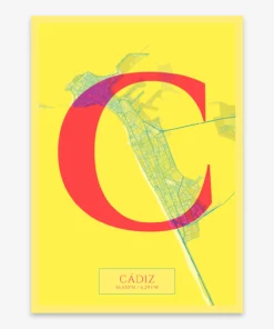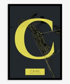 Personalize this Cadiz Poster V06, designed with a composition of the map of Cadiz and the letter C or purchase it with this graphic design ready to add to your cart. A special gift to decorate the walls of lovers of graphic design and typography.