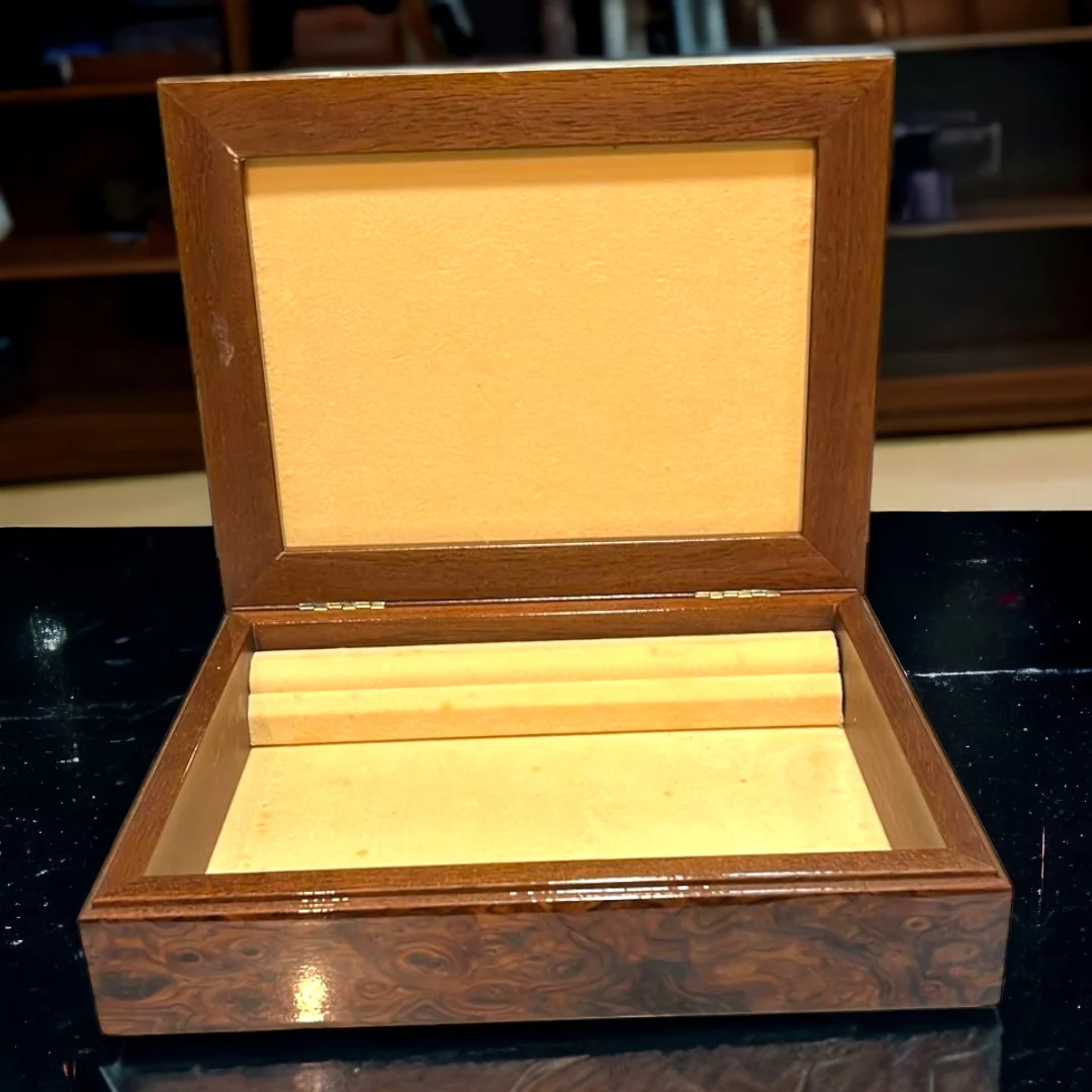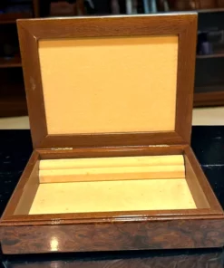 ¡Disfruta del placer de fumar con estilo y elegancia gracias a nuestra caja de cigarros hecha en madera! La tapa con acabado de plata barnizada asegura la conservación de tus cigarros y añade un toque sofisticado a tu colección. La caja perfecta para cualquier amante del buen fumar. Decora tu mesa con elegancia, medidas 18 x 23 cm.