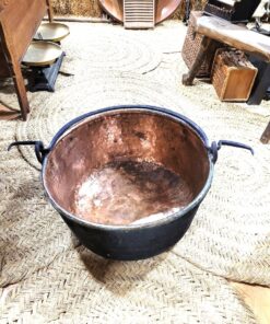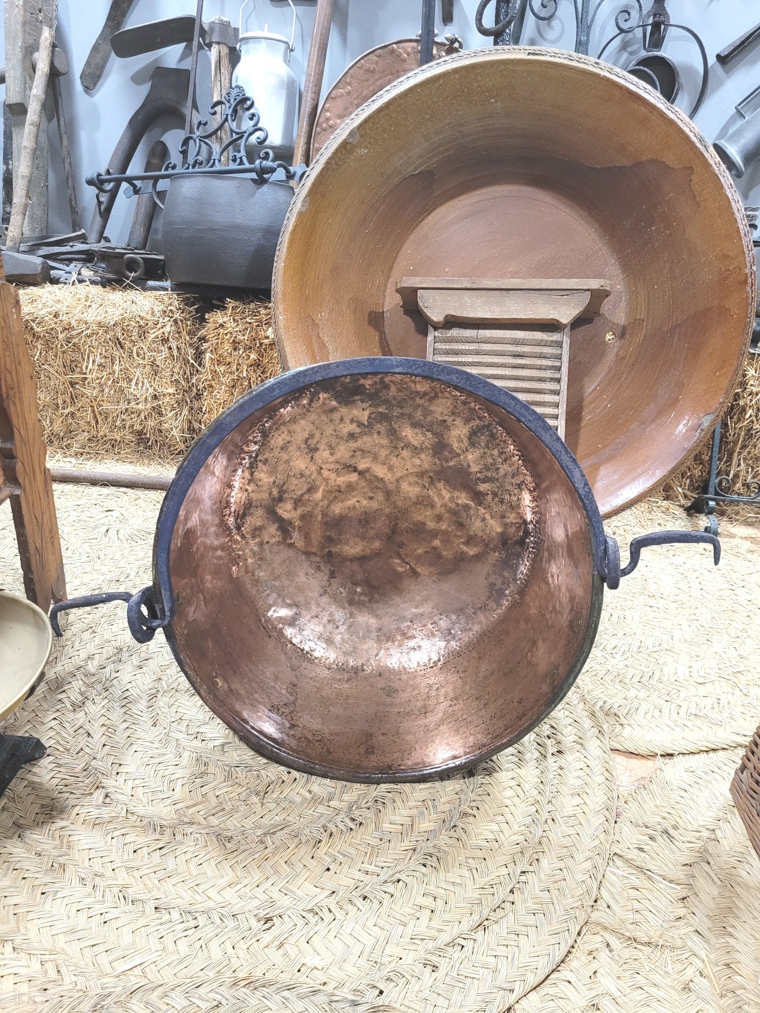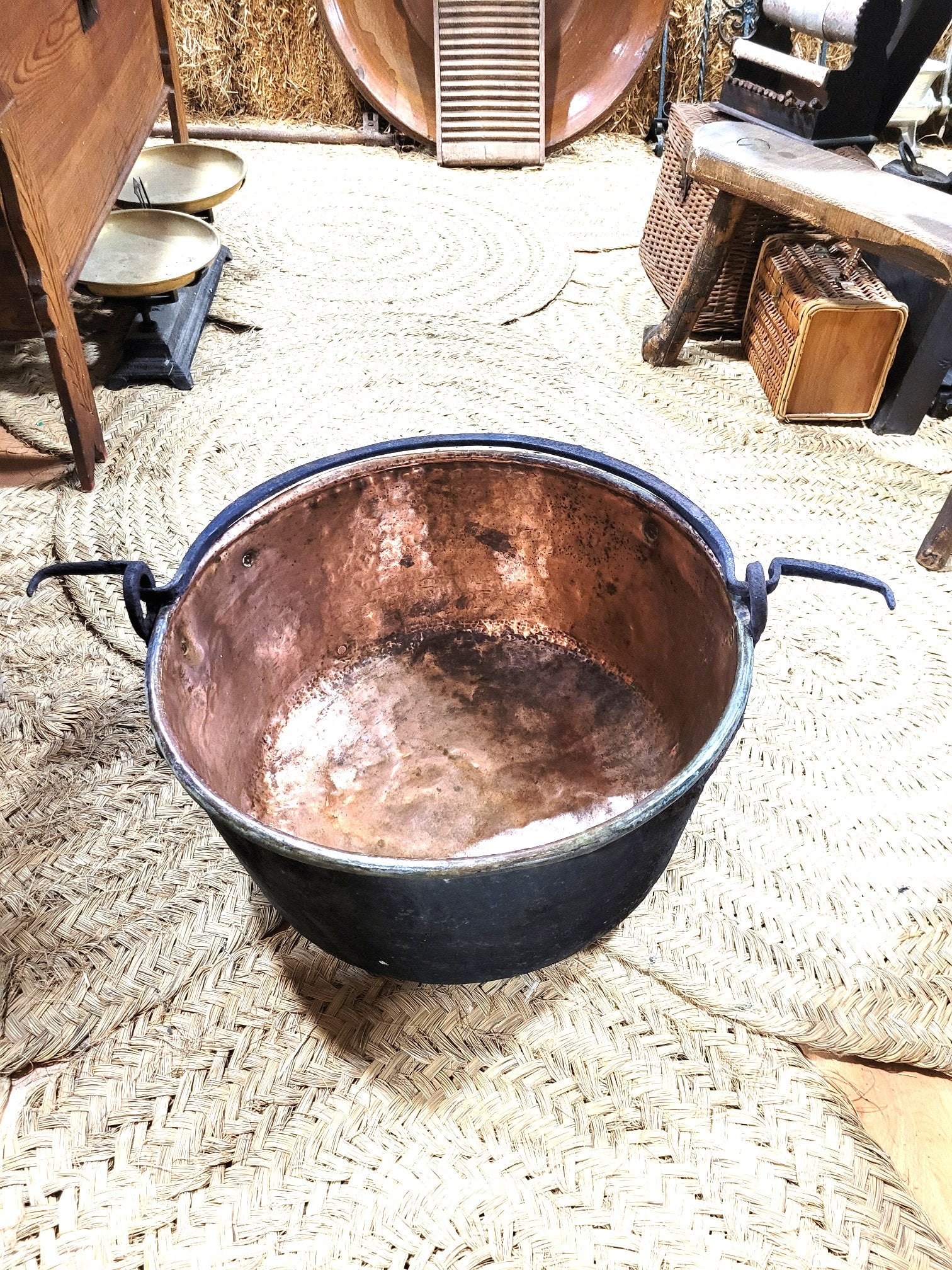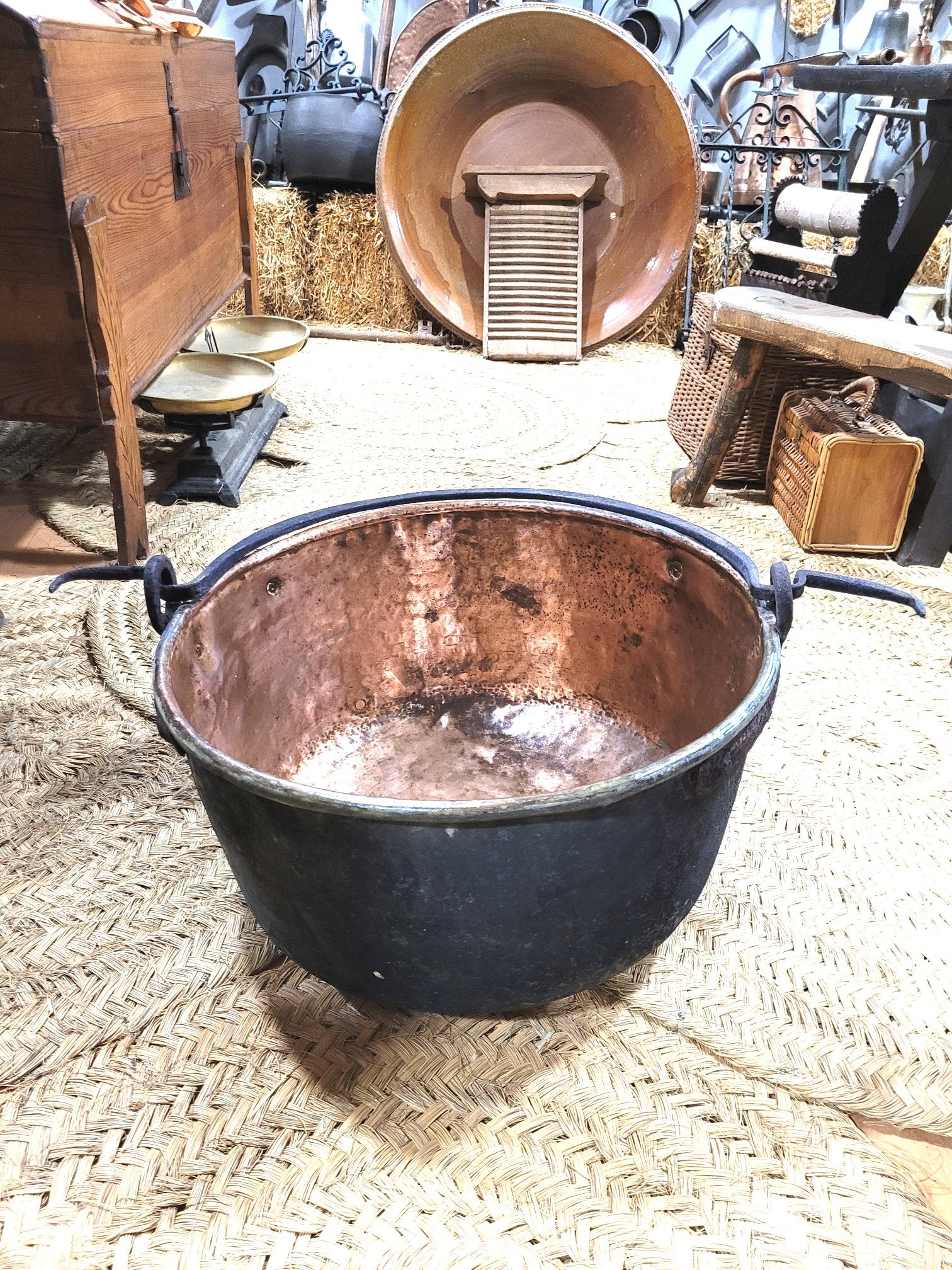 Antiguo caldero grande, fabricado en cobre amartillado y con herrajes de fragua, interior limpio y barnizado, para no tener que limpiar, ideal para decoración o leñera. !! artículo de excelentes calidades!!