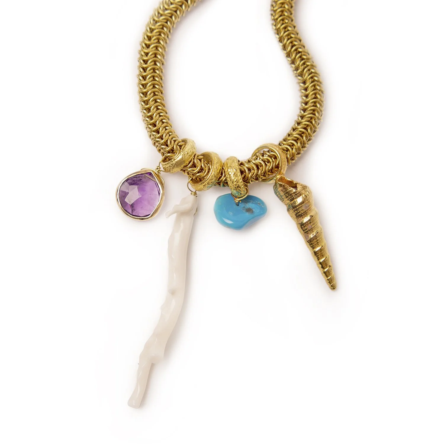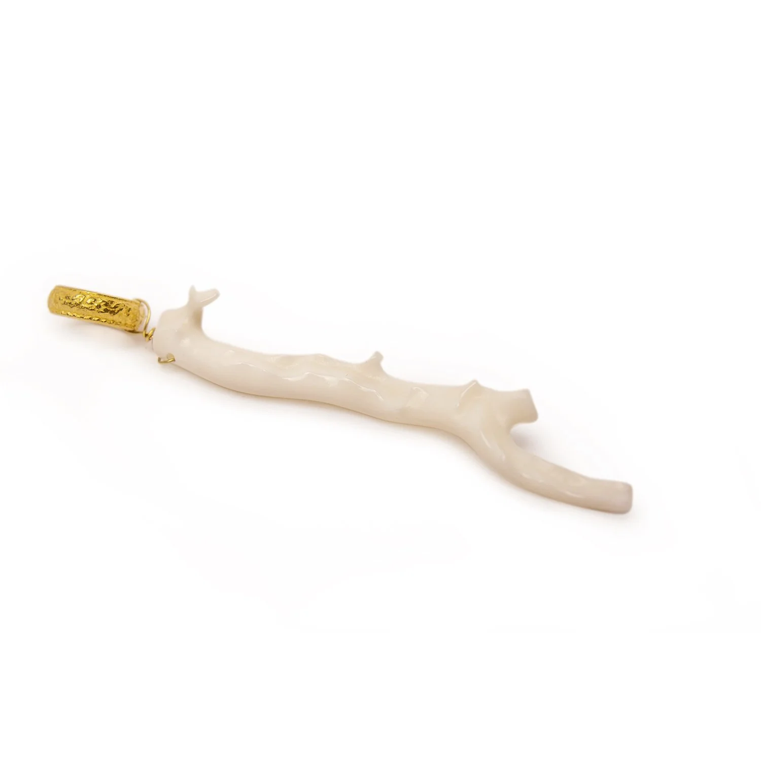 Colgante hecho a mano de latón con coral blanco en forma de rama. Se puede colgar de una gargantilla rígida, cualquiera de nuestras cadenas o de las pieles trenzadas.