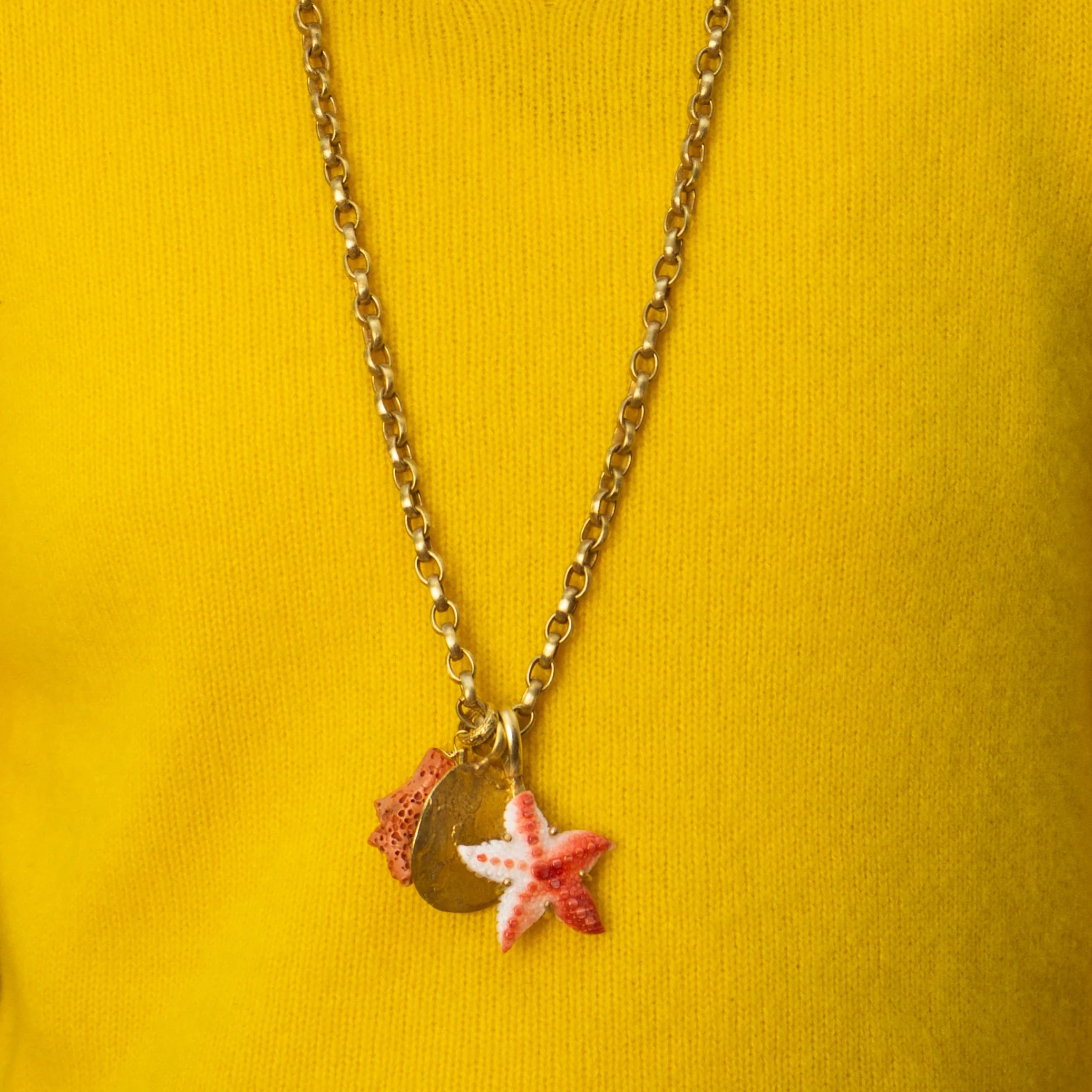 Colgante hecho a mano por nuestros artesanos en México. Unas garras de latón atrapan un cabujón de concha natural en forma de estrella de mar.