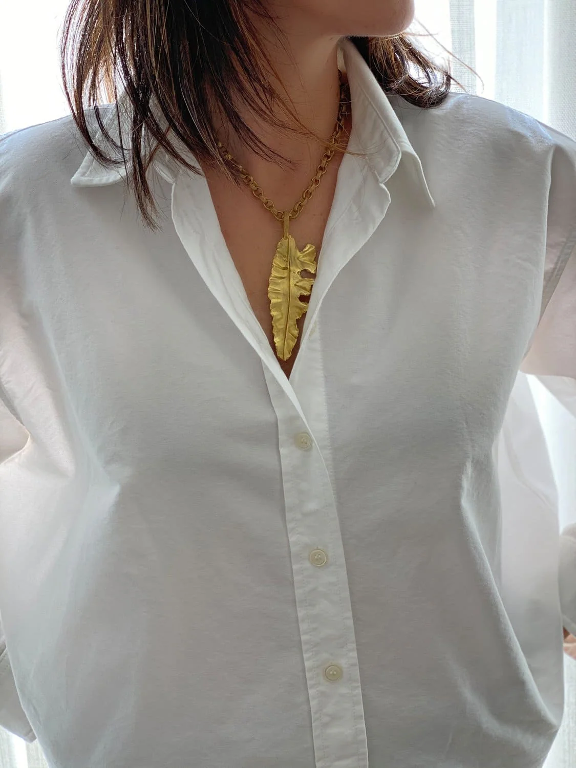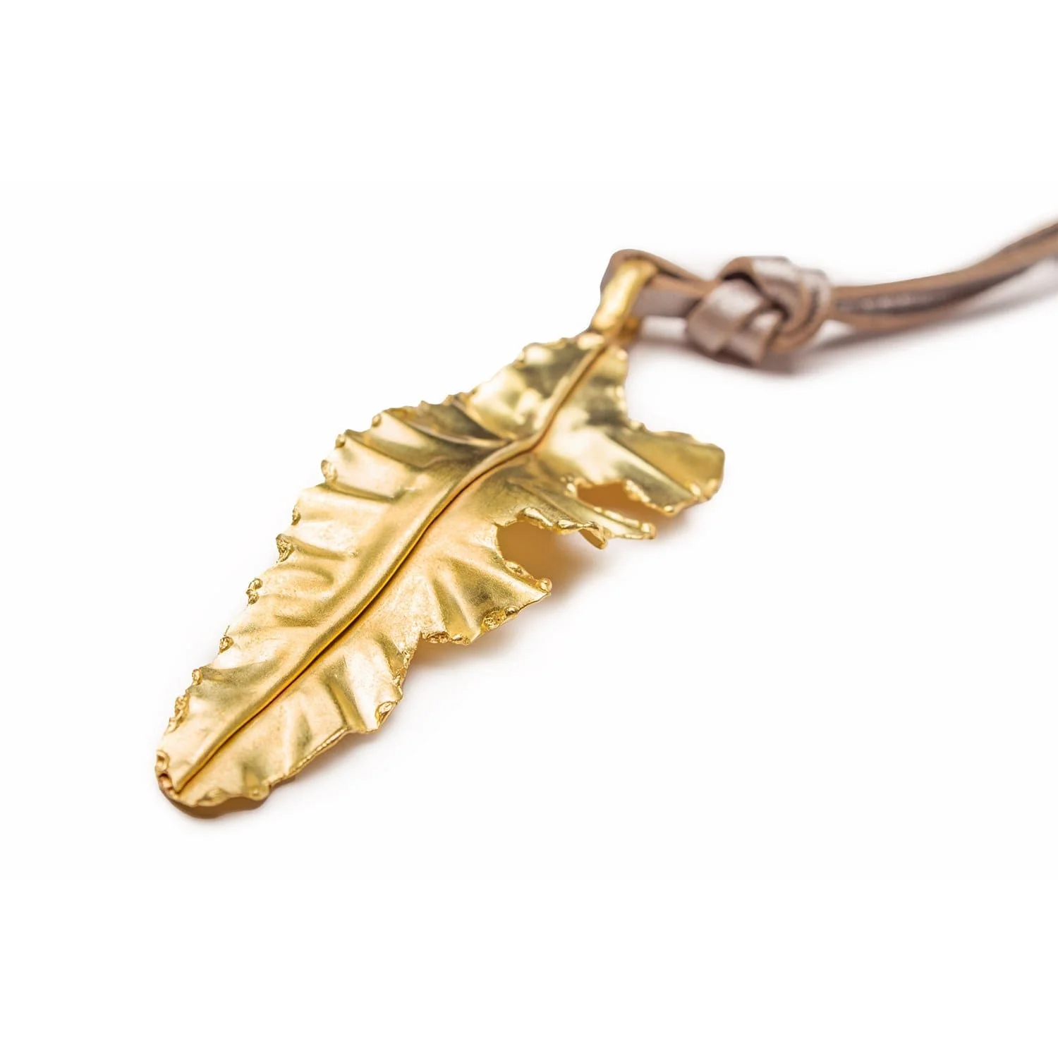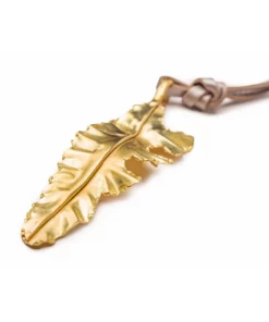 Colgante en forma de hoja hecho a partir de lámina de latón cortada y doblada a mano, sin moldes, y con el contorno comido por el fuego, para conseguir ese acabado irregular. Incluye la piel color plata.