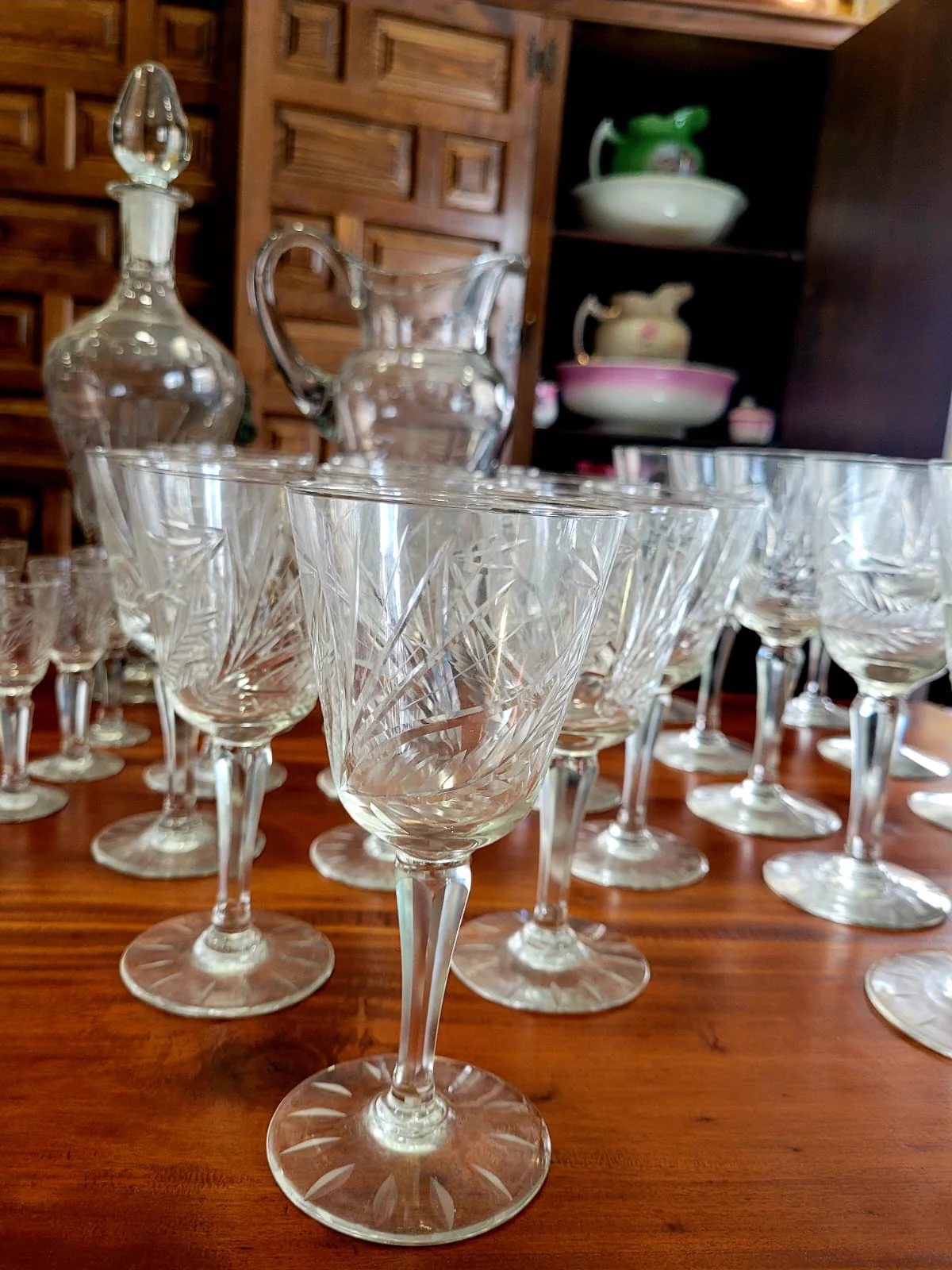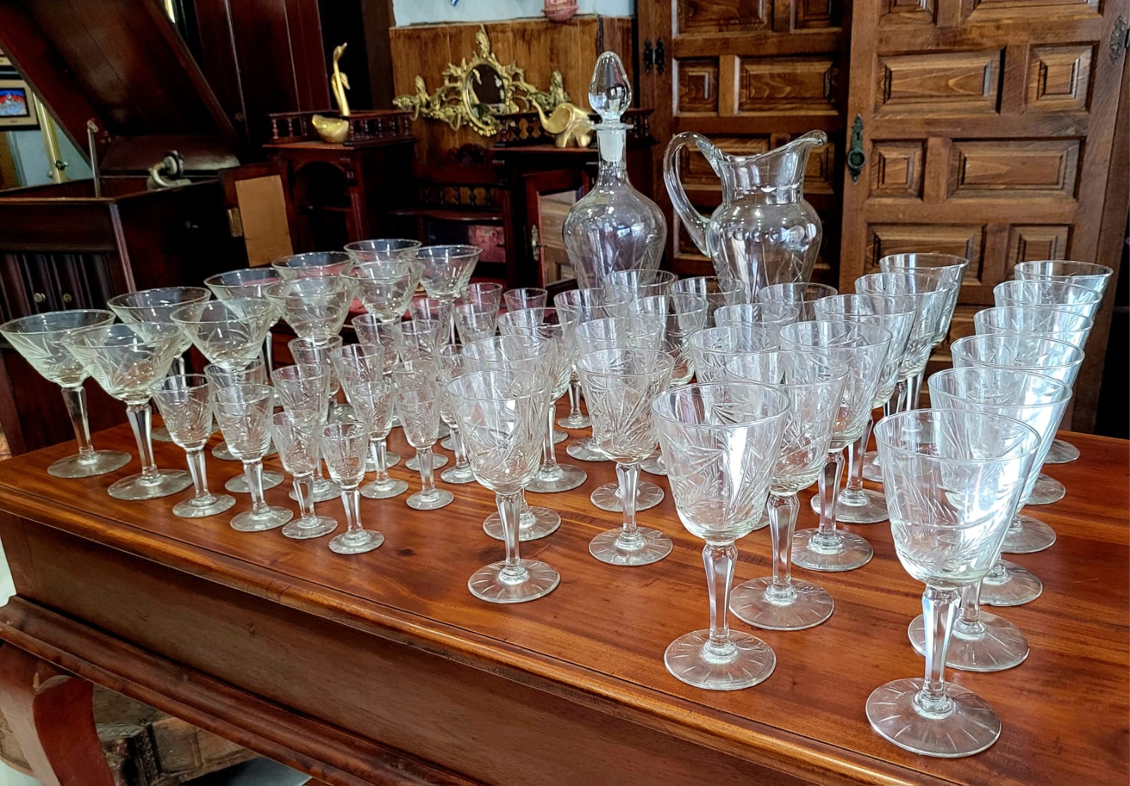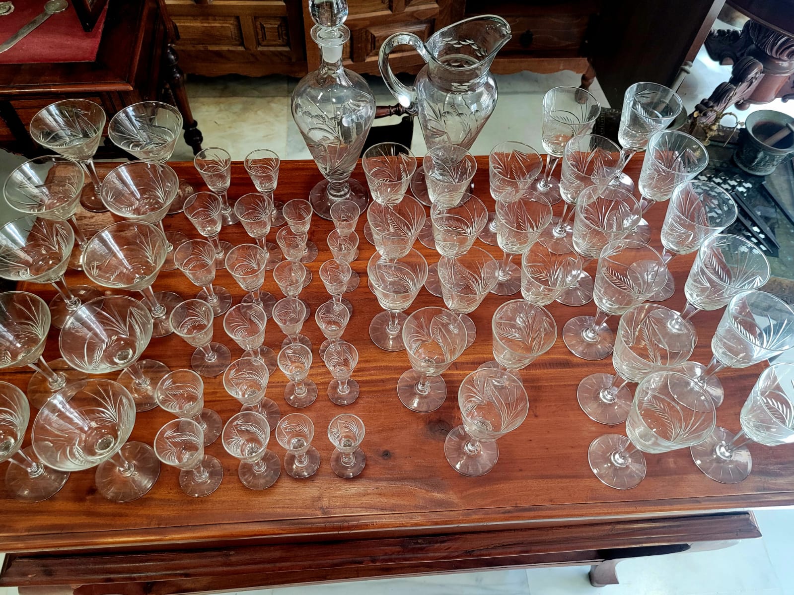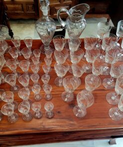 Añade un toque de sofisticación a tu hogar con esta espectacular cristalería tallada en cristal francés de los años 80. Con 62 piezas cuidadosamente diseñadas, este conjunto incluye una jarra, una botella licorera y copas para vino, agua, champán y licor. Perfecta para 12 comensales, su diseño atemporal y calidad superior realzarán cualquier mesa, creando un ambiente único y refinado.