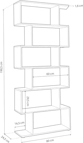 - Con unas dimensiones de 190,5 cm de alto, 80 cm de ancho y 24,5 cm de fondo, esta estantería ofrece una amplia capacidad de almacenamiento sin ocupar demasiado espacio. Sus estantes a la vista están dispuestos de forma irregular, lo que le otorga un aspecto moderno y dinámico, perfecto para realzar la estética de tu sala de estar o cualquier otra habitación de tu casa.