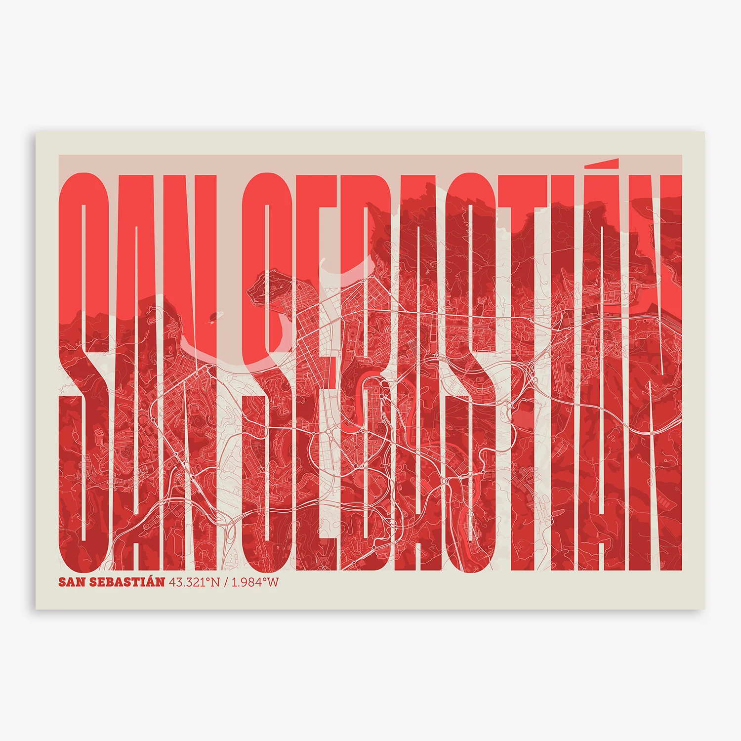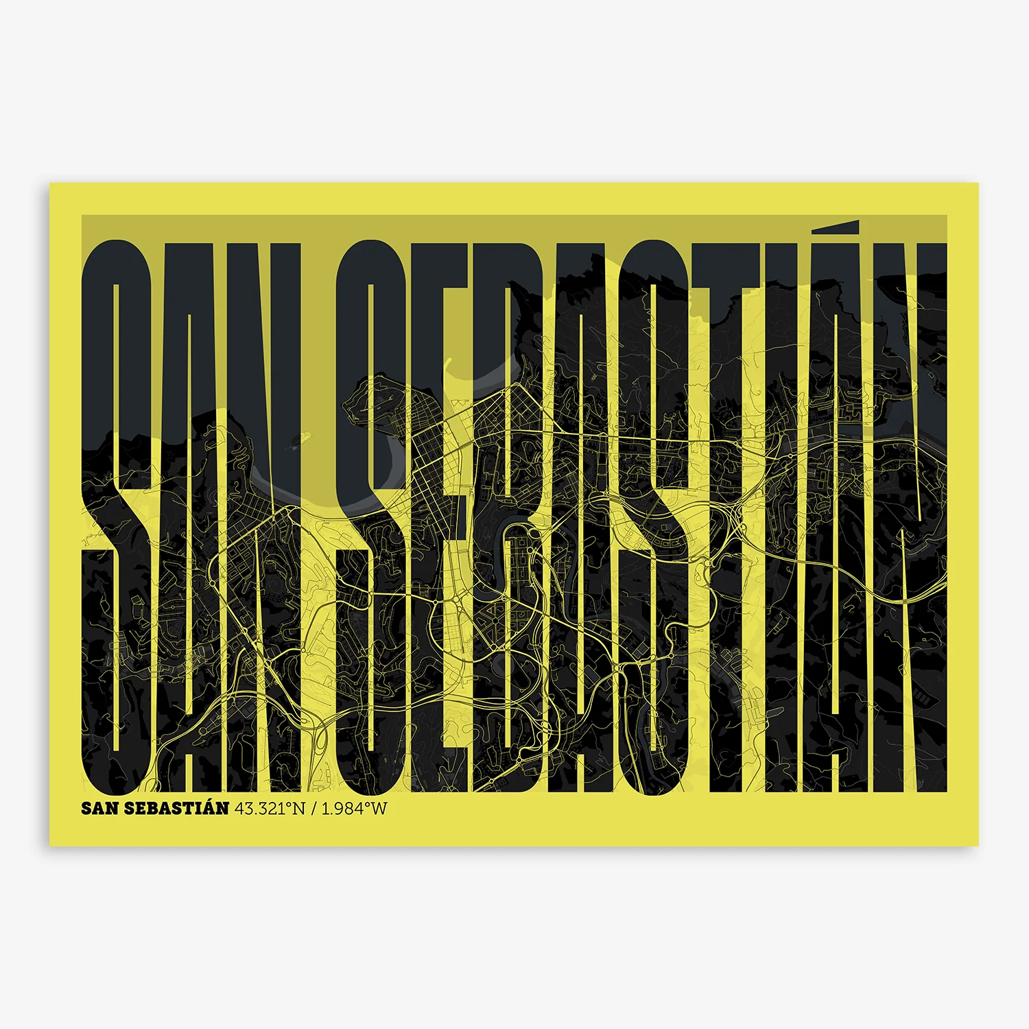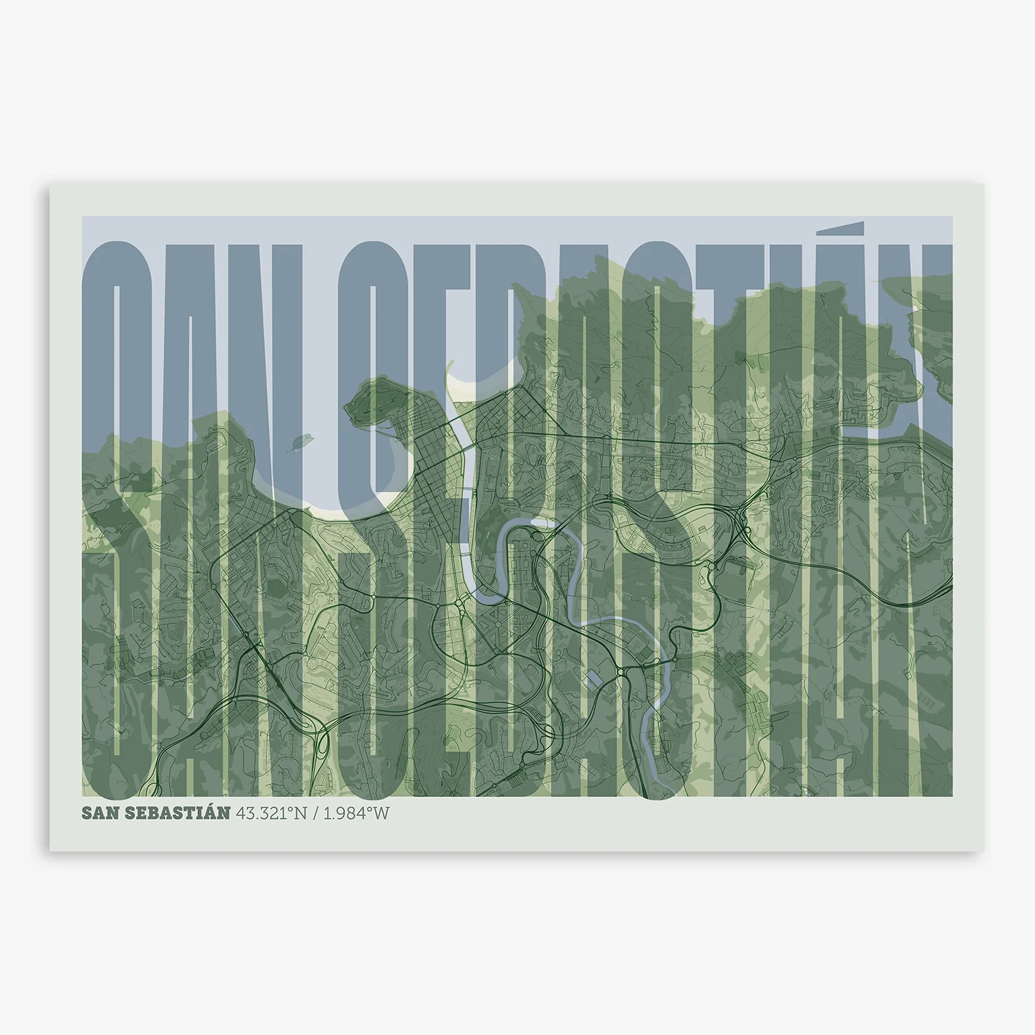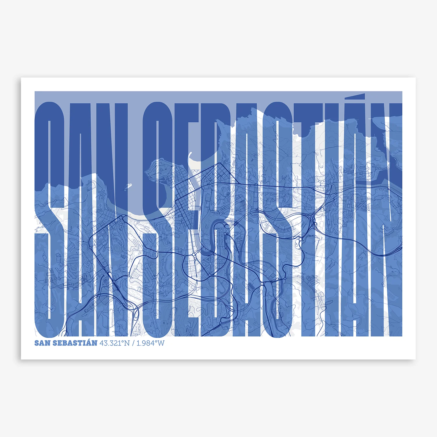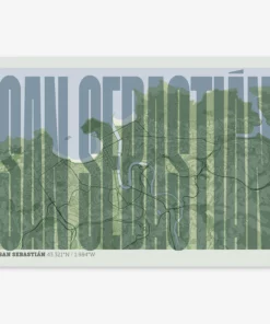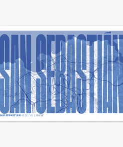 Personalize this San Sebastian Poster V09, designed with a composition of the map of San Sebastian and the letters of its full name. Perfect for decorating any corner of your home and taking a little piece of this city with you. A cool gift to decorate the walls of lovers of graphic design and typography.